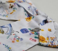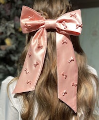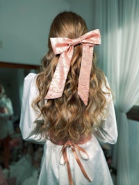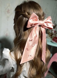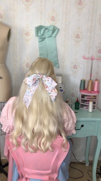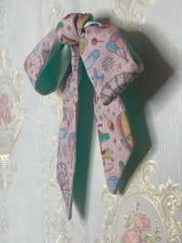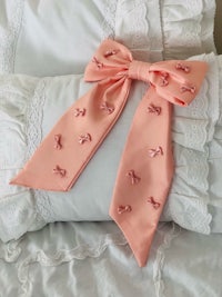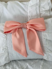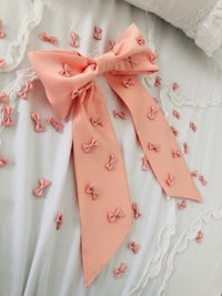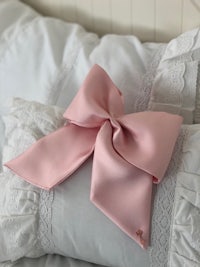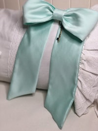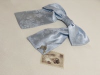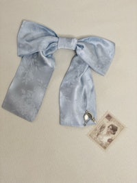 ״בלו בלוסום״ פפיון מבד מאוד עדין בגוון תכלת מבריק ועיטורי פרחים המשקיפים בברק ואבזמי מראה ומסרק.