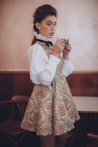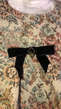 שמלת סרפן עשויה בד גובלן עם רקמה משולבט בחוטי זהב מנצנצים ומתחת חולצת תחרה שוויצרית עם שרוול כפול נפוח וסרט סאטן הנקשר סביב הצווארון העומד.